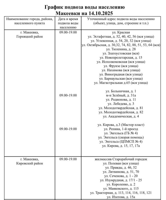 Завтра, 14 октября, в Макеевке будет организован подвоз воды для жителей, в дома которых не поступила вода в установленный графикомдень.