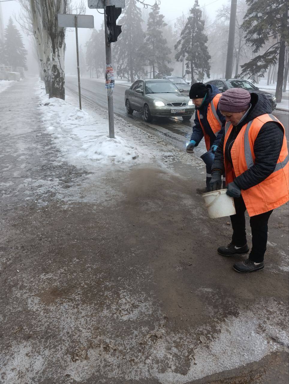 Сотрудники «Песпективы» выполняют отсыпку пешеходных дорог противогололёдными материалами, обеспечивая безопасность горожан в зимний период.