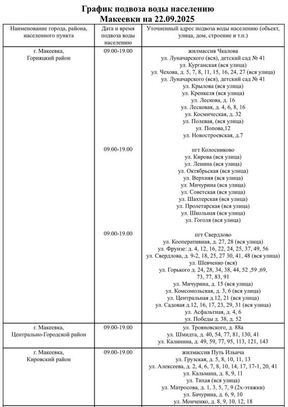 Сегодня, 22 сентября, в Макеевке будет организован подвоз воды для жителей, в дома которых из-за недостаточного количества подаваемой воды не поступила вода в установленный графиком день.Напоминаем, что для удобства отработки сообщений горожан...