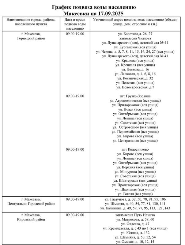 Завтра, 17 сентября, в Макеевке будет организован подвоз воды для жителей, в дома которых из-за недостаточного количества подаваемой воды не поступила вода в установленный графиком день. Запланированы реновация жилого фонда и...