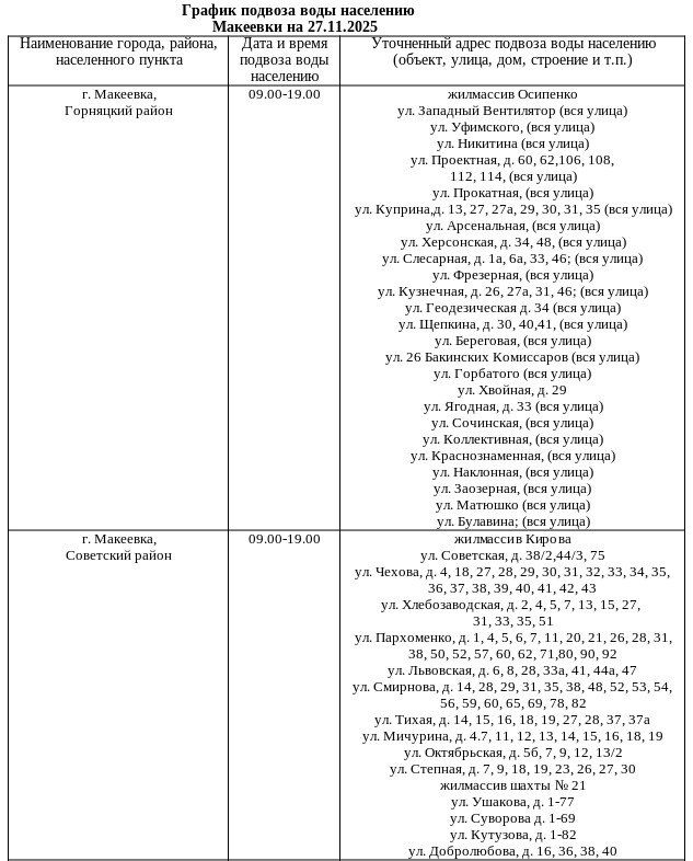 Завтра, 27 ноября, в Макеевке будет организован подвоз воды для жителей, в дома которых не поступила вода в установленный графиком день.