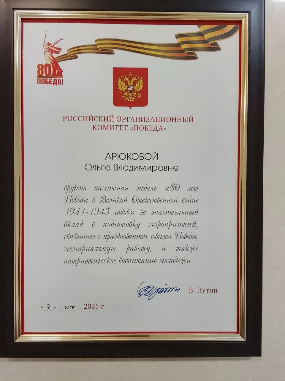 Нашему учителю Арюковой Ольге Владимировне сегодня, в Совете Федерации России, была вручена памятная медаль "80 лет Победы в Великой Отечественной войне".