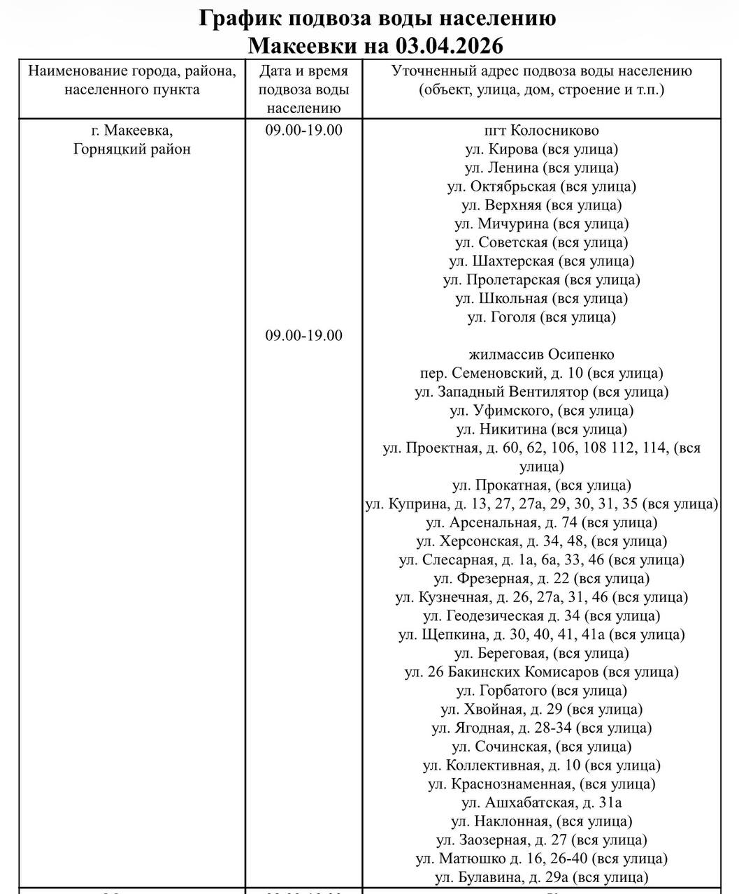 Советский район:м-н Первомайский, д. 4, 6, 20, 27 – 10.04.2026;ул. Зелёная, д. 7 – 12.04.2026.Горняцкий район:ул. Энгельса, д. 6, 8 – 2-й квартал 2026;ул. Клубная, д. 2, 4 – 2-й квартал 2026;ул. Ушинского, д. 5/12, 10/11, 20/1 – 2-й квартал 2026;ул....